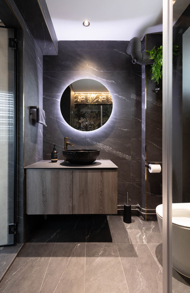 Curated plant inspired tiles to blend the garden theme within the segregated basin area from the common bath & wc area.